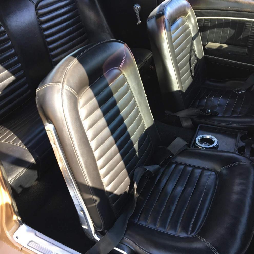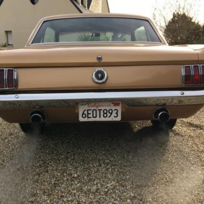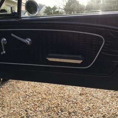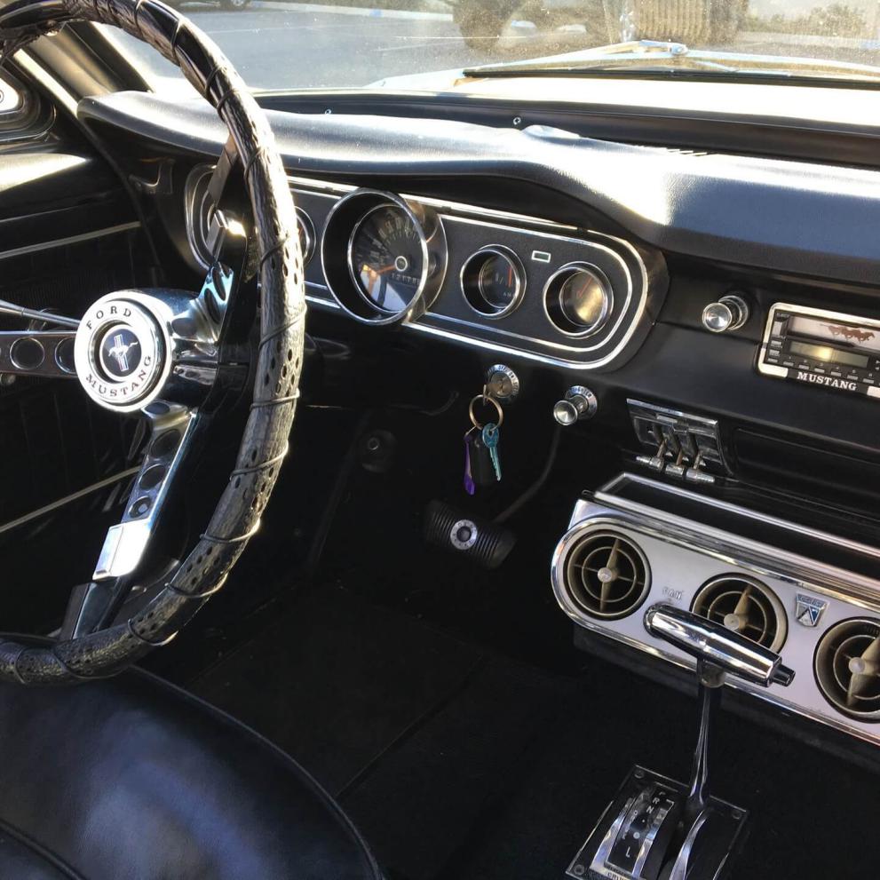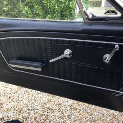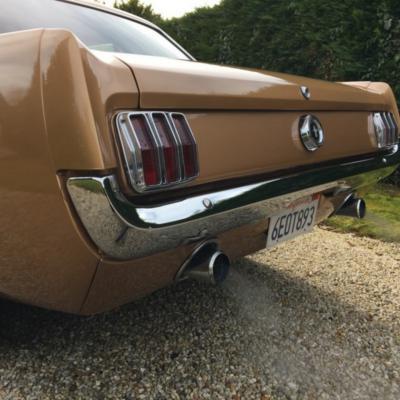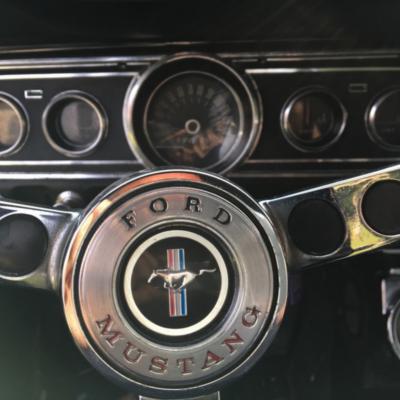 Il s'agit d'une Mustang GT avec toutes les spécifications de la GT en 1965, code A pour le moteur qui est d'origine '' matching number '', les jauges sur le tableau de bord, le double échappement sortant de la jupe arrière, les emblèmes sur les cotés associés au bandes noires, les '' fog lights '', elle est également équipée de la climatisation et de la direction assistée. Le moteur et la transmission ont été reconditionnés dans les années 90.