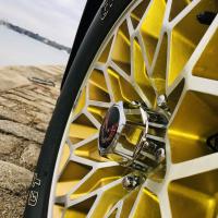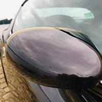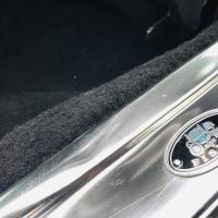 A l'intérieur la sellerie noire est associée à la célèbre planche de bord en alu bouchonné de couleur gold, rappelant cette même couleur à l'extérieur.